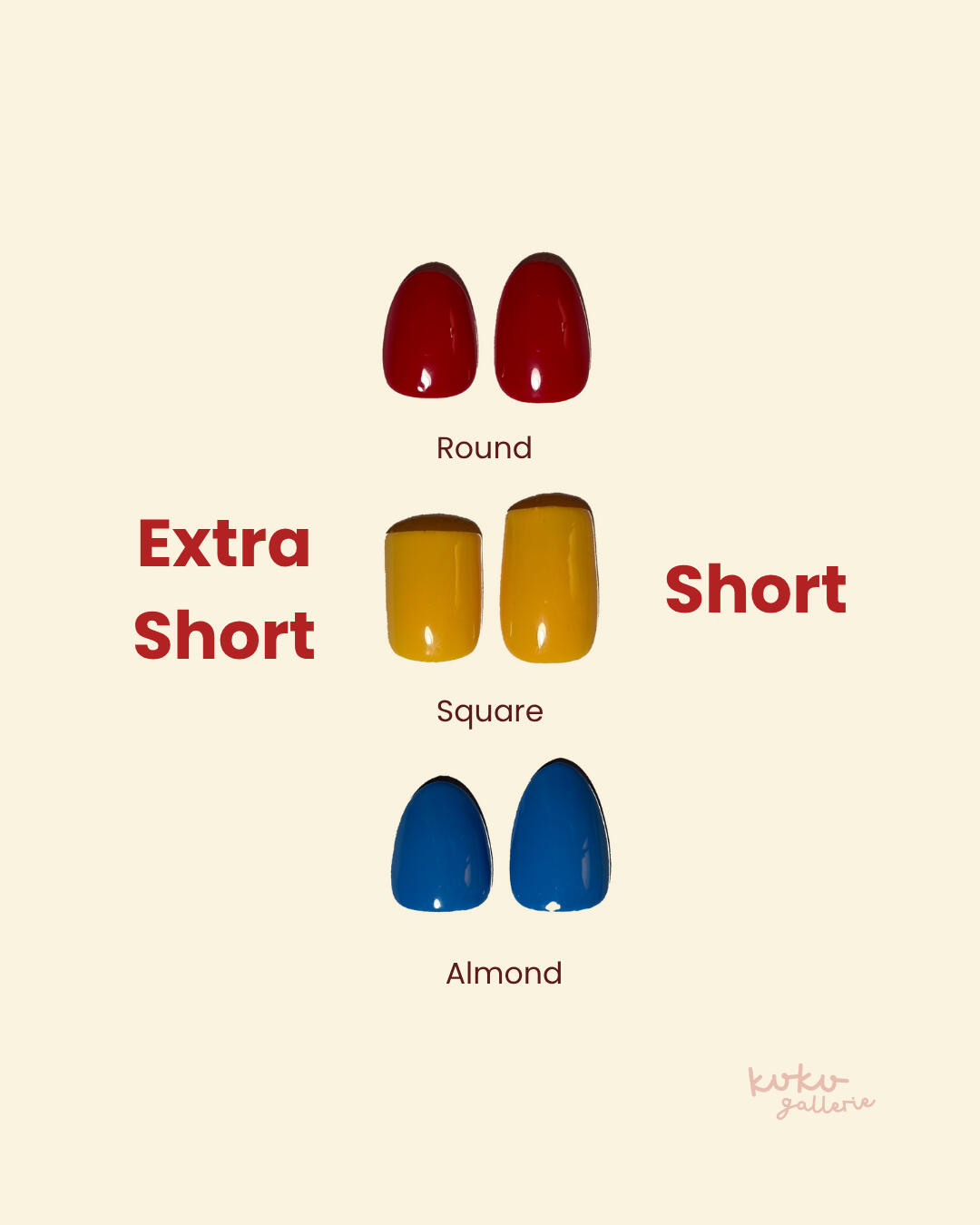 You can choose from any of the shapes and lengths below for your press on set.